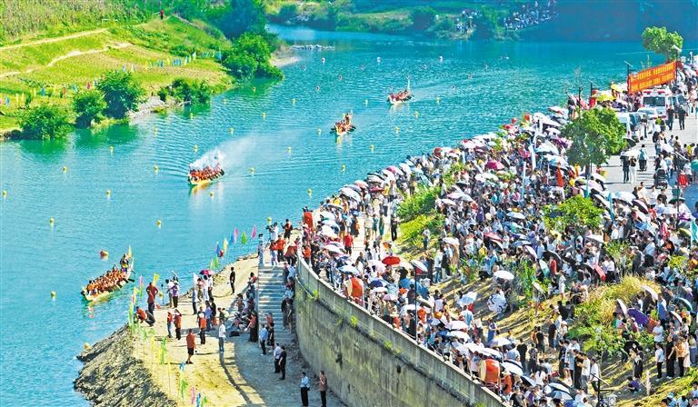 2025年10月7日,重庆市彭水苗族土家族自治县郁山镇举行龙舟竞赛,引来众多游客驻足观看。图为参赛选手正划着龙舟奔赴参赛现场。赵 勇摄(中经视觉)