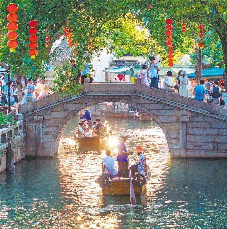 10月6日,江苏省苏州市吴江区同里古镇,游客乘坐摇橹船游览。