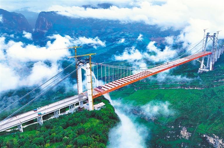 近日,由中铁广州工程局集团承建的贵州安(顺)盘(州)高速公路天门特大桥顺利合龙。天门特大桥是安盘高速公路的重要控制性工程,位于贵州省六盘水市水城区境内,横跨北盘江大峡谷,全长1553米,桥面至峡谷水面高度为560米。本报记者 吴秉泽摄