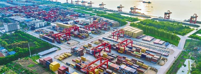 10月17日,安徽省芜湖港朱家桥港区国际集装箱码头,货车往来穿梭,船舶停靠在泊位上有序装卸集装箱,一派繁忙景象。