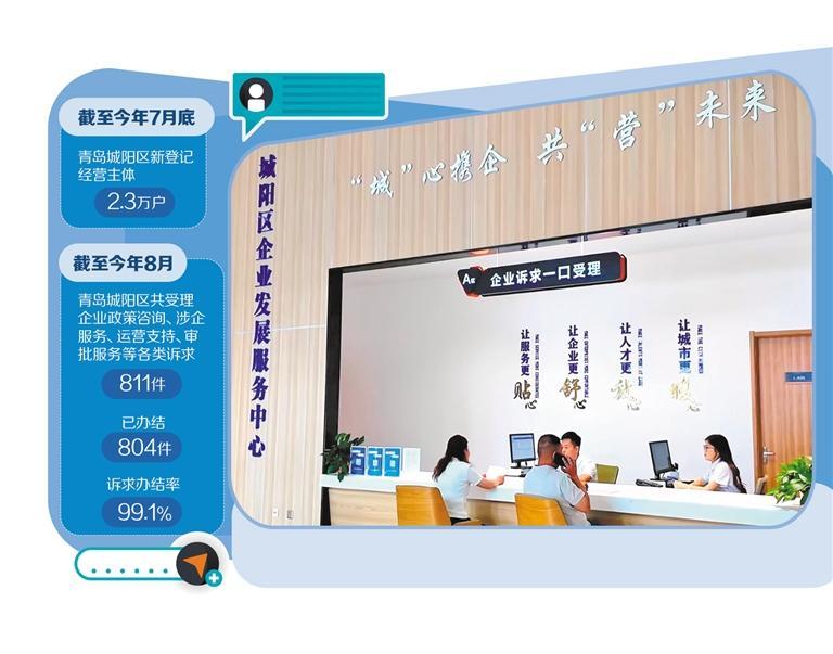 城阳区营商环境建设中心主任花胜刚介绍,截至2025年8月,城阳区共受理企业政策咨询、涉企服务、运营支持、审批服务等各类诉求811件,已办结804件,诉求办结率99.1%。为延伸服务触角,城阳区还将企业诉求受理延伸至8个街道、14个企业园区,做到“企业呼声在哪,服务就跟到哪”。