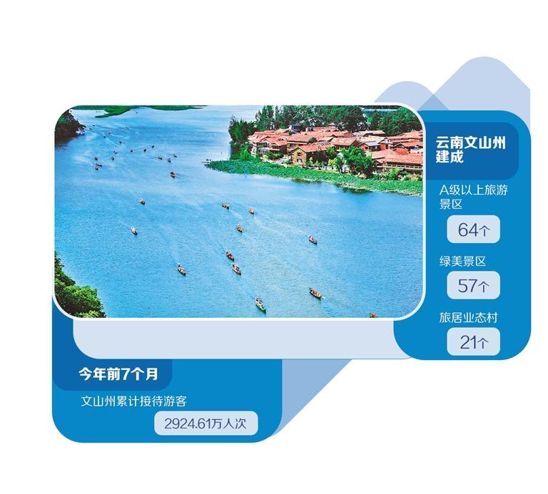 近年来,文山州依托优势资源,全力打造乡村旅居、城镇旅居、医养旅居、度假旅居、文艺旅居、边境旅居、体育旅居、养老旅居等业态,加快推进旅居模式、业态、产品创新和服务创优,具象化打造“有一种叫云南的生活——三七之乡·康养文山”,建成A级以上旅游景区64个、绿美景区57个、旅居业态村21个。
