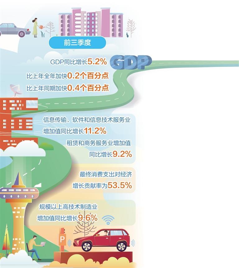 从经济增长看,前三季度,GDP同比增长5.2%,比上年全年和上年同期分别加快0.2个、0.4个百分点;经济增量达到39679亿元,同比多增1368亿元。