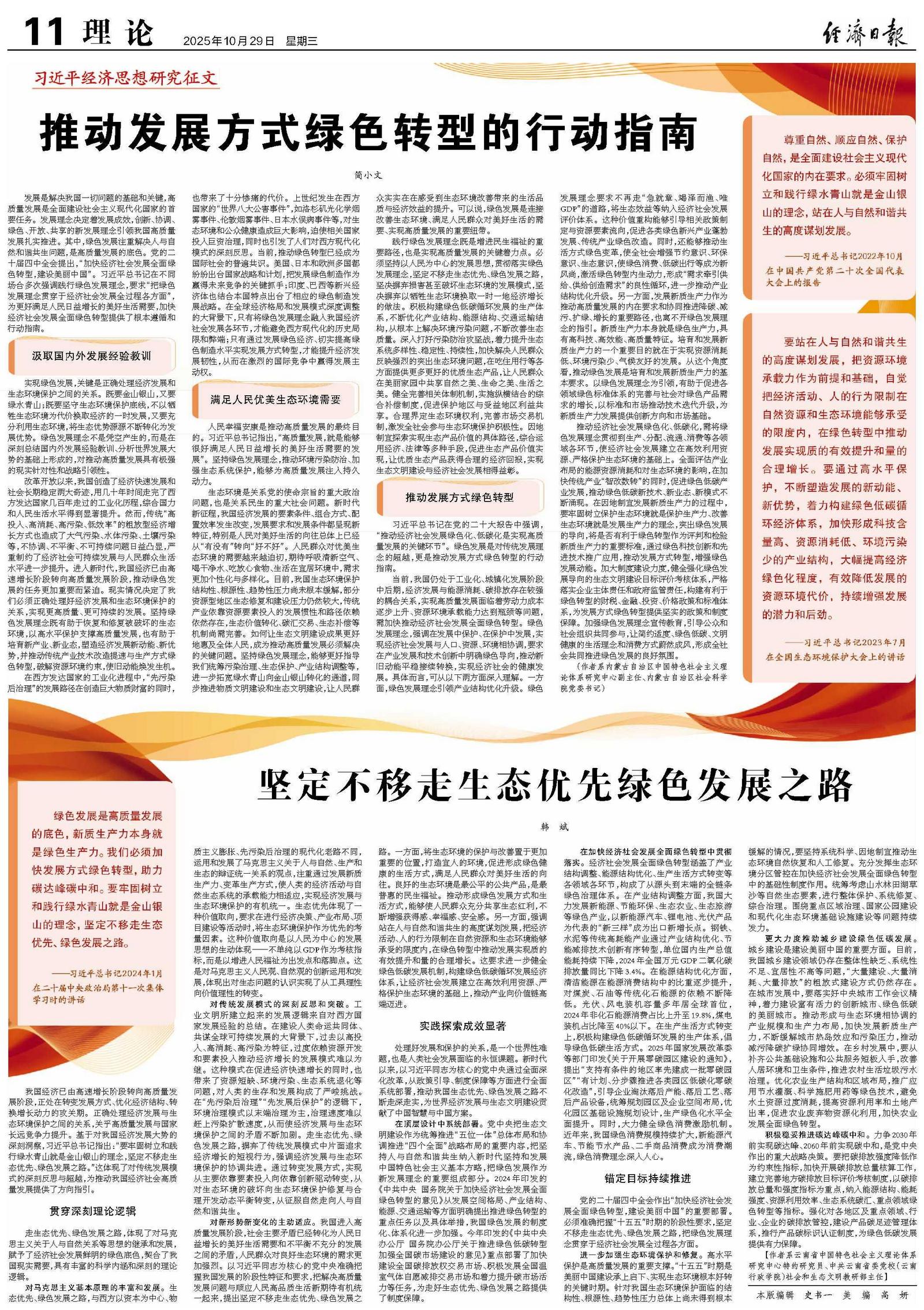 发展是解决我国一切问题的基础和关键,高质量发展是全面建设社会主义现代化国家的首要任务。发展理念决定着发展成效,创新、协调、绿色、开放、共享的新发展理念引领我国高质量发展扎实推进。其中,绿色发展注重解决人与自然和谐共生问题,是高质量发展的底色。党的二十届四中全会提出,“加快经济社会发展全面绿色转型,建设美丽中国”。习近平总书记在不同场合多次强调践行绿色发展理念,要求“把绿色发展理念贯穿于经济社会发展全过程各方面”,为更好满足人民日益增长的美好生活需要,加快经济社会发展全面绿色转型提供了根本遵循和行动指南。