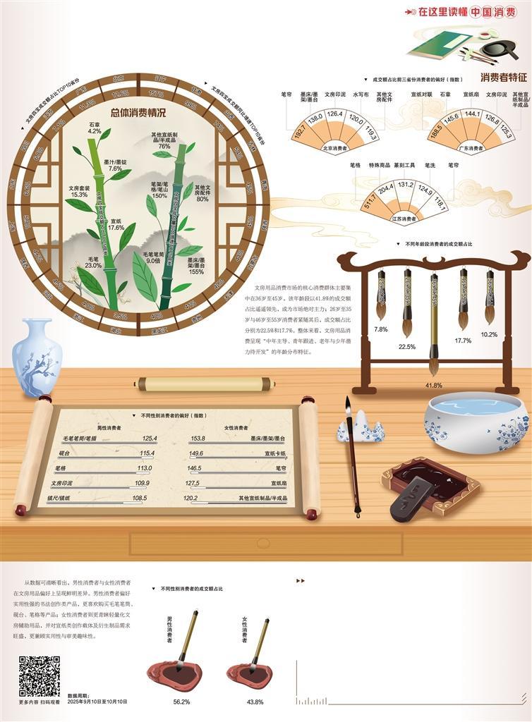 消费者特征的持续变化,勾勒出文房四宝消费的新趋势。从消费者年龄看,36岁至45岁消费者是主力消费群体,成交额占比为41.8%;26岁至35岁消费者的成交额占比达22.5%,年轻一代逐步成为传统文化消费的新生力量。此外,不同省份消费者偏好各具特色,如北京消费者偏爱笔帘,广东消费者钟情宣纸对联,江苏消费者对笔格需求旺盛,地域文化特色深刻影响消费选择。