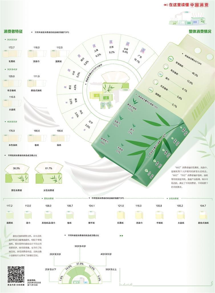 从消费群体看,女性消费者的生活用纸成交量占比超六成,尤其爱买乳霜纸、洗脸巾等融合护肤概念的纸品;男性消费者则更青睐湿厕纸、湿巾等强调清洁效率与便捷使用的品类。