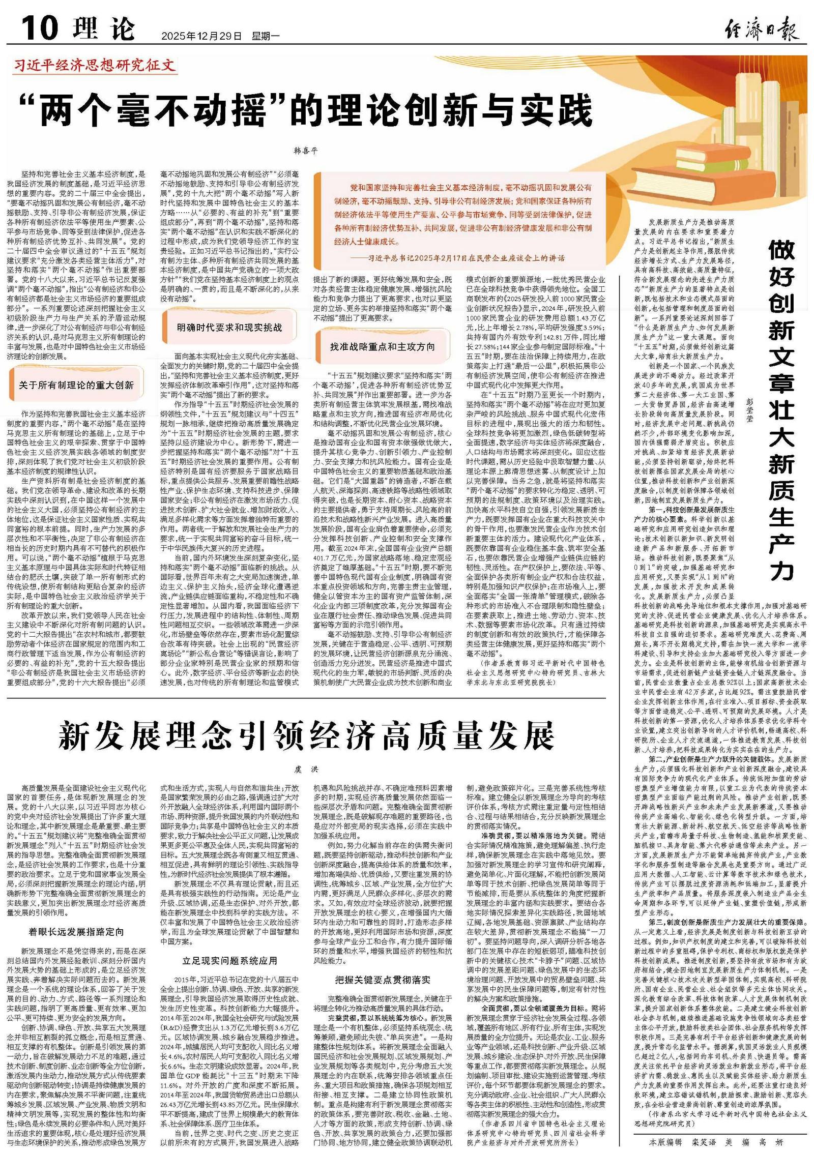 发展新质生产力是推动高质量发展的内在要求和重要着力点。习近平总书记指出,“新质生产力是创新起主导作用,摆脱传统经济增长方式、生产力发展路径,具有高科技、高效能、高质量特征,符合新发展理念的先进生产力质态”“新质生产力的显著特点是创新,既包括技术和业态模式层面的创新,也包括管理和制度层面的创新”。一系列重要论述深刻回答了“什么是新质生产力、如何发展新质生产力”这一重大课题。面向“十五五”时期,必须做好创新这篇大文章,培育壮大新质生产力。