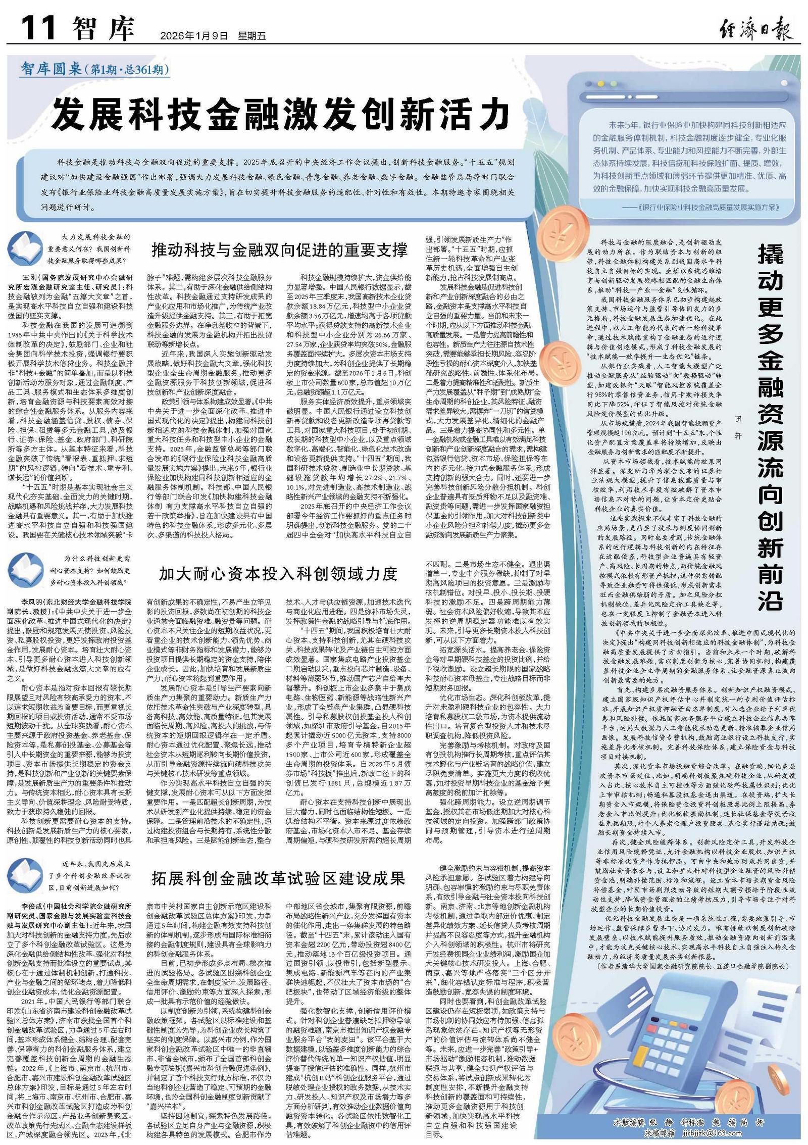 科技金融是推动科技与金融双向促进的重要支撑。2025年底召开的中央经济工作会议提出,创新科技金融服务。“十五五”规划建议对“加快建设金融强国”作出部署,强调大力发展科技金融、绿色金融、普惠金融、养老金融、数字金融。金融监管总局等部门联合发布《银行业保险业科技金融高质量发展实施方案》,旨在切实提升科技金融服务的适配性、针对性和有效性。本期特邀专家围绕相关问题进行研讨。