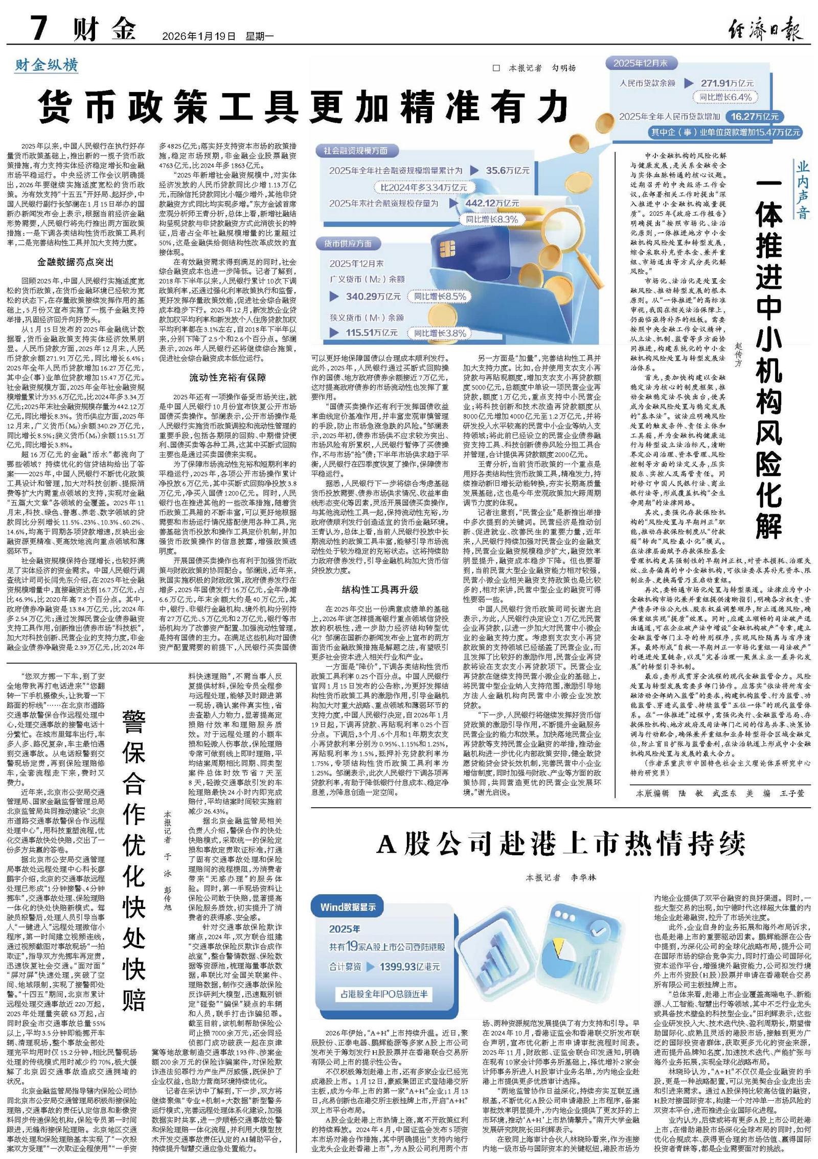在有效融资需求得到满足的同时,社会综合融资成本也进一步降低。记者了解到,2018年下半年以来,人民银行累计10次下调政策利率,还通过强化利率政策执行和监督,更好发挥存量政策效能,促进社会综合融资成本稳步下行。2025年12月,新发放企业贷款加权平均利率和新发放个人住房贷款加权平均利率都在3.1%左右,自2018年下半年以来,分别下降了2.5个和2.6个百分点。邹澜表示,2026年人民银行还将继续综合施策,促进社会综合融资成本低位运行。