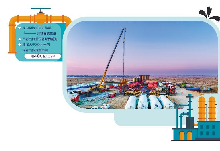 资源禀赋支撑战略选择。数据显示,全球页岩油储量在11万亿吨至13万亿吨之间,页岩气资源量约为456万亿立方米,是当前世界常规天然气探明总储量的2倍以上。我国页岩油可采储量居世界第三位,页岩气储量位居世界前列,埋深大于2000米的煤岩气资源量预测超40万亿立方米。