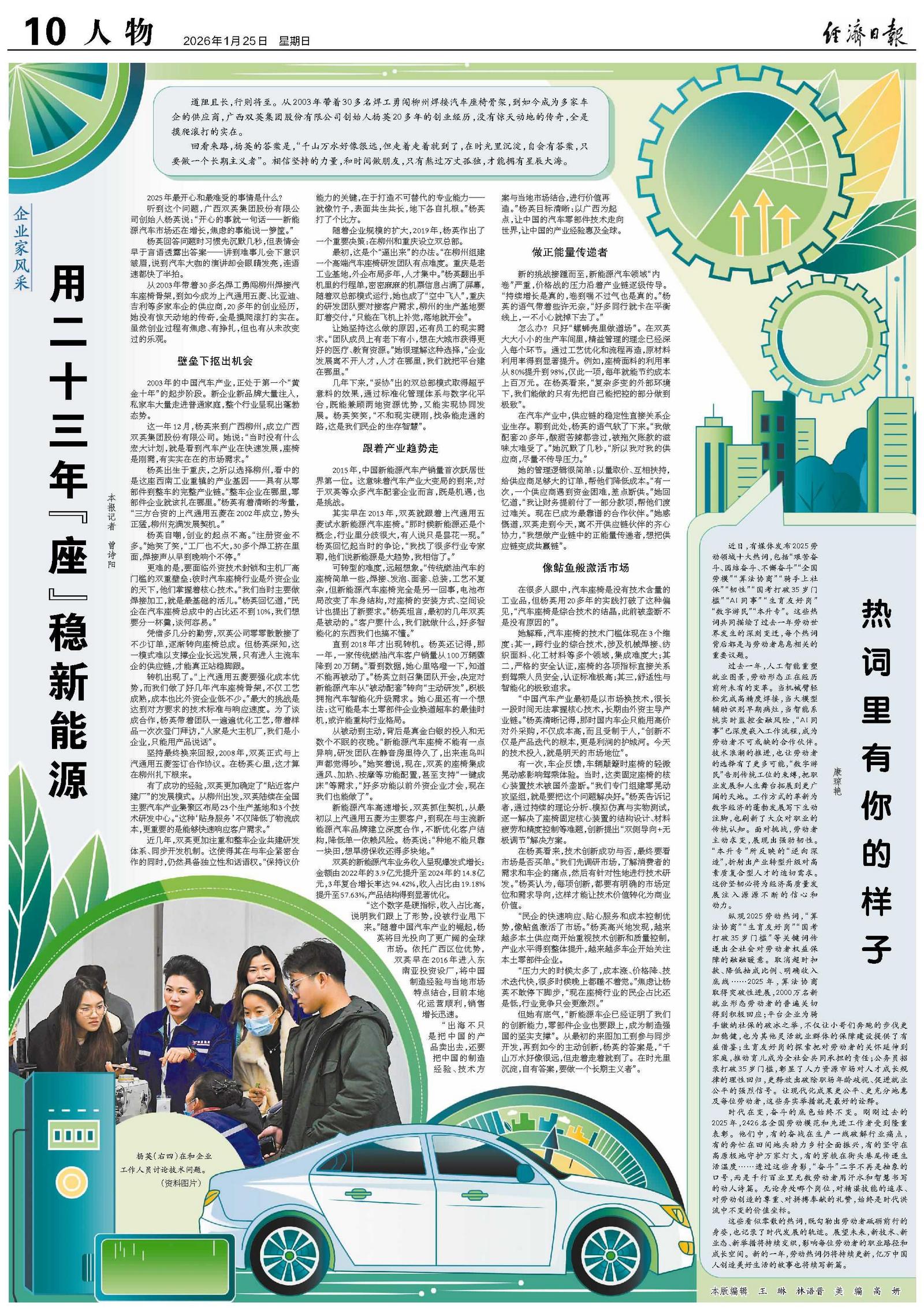 这一年12月,杨英来到广西柳州,成立广西双英集团股份有限公司。她说:“当时没有什么宏大计划,就是看到汽车产业在快速发展,座椅是刚需,有实实在在的市场需求。”