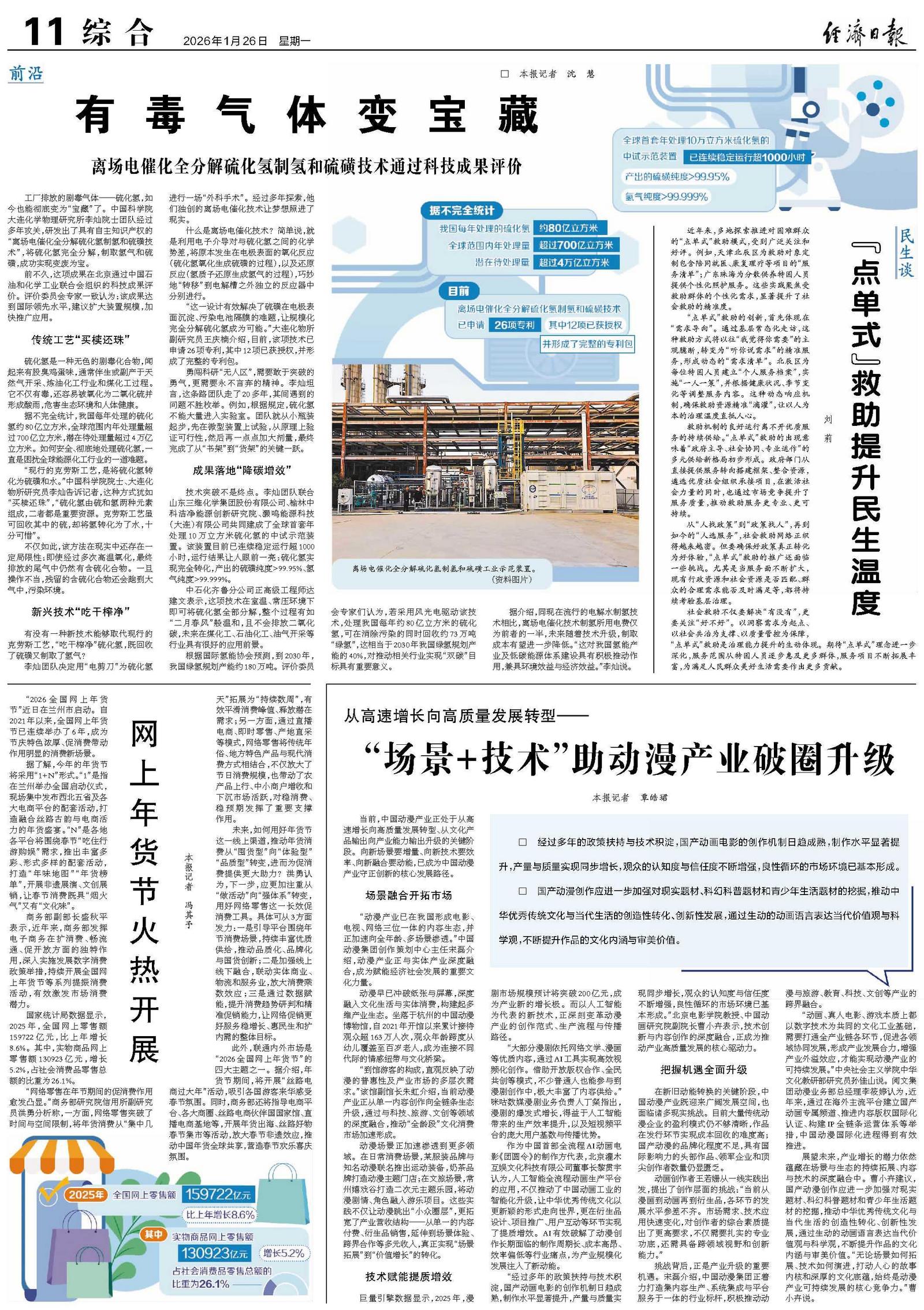 根据国际氢能协会预测,到2030年,我国绿氢规划产能约180万吨。评价委员会专家们认为,若采用风光电驱动该技术,处理我国每年约80亿立方米的硫化氢,可在消除污染的同时回收约73万吨“绿氢”,这相当于2030年我国绿氢规划产能的40%,对推动相关行业实现“双碳”目标具有重要意义。