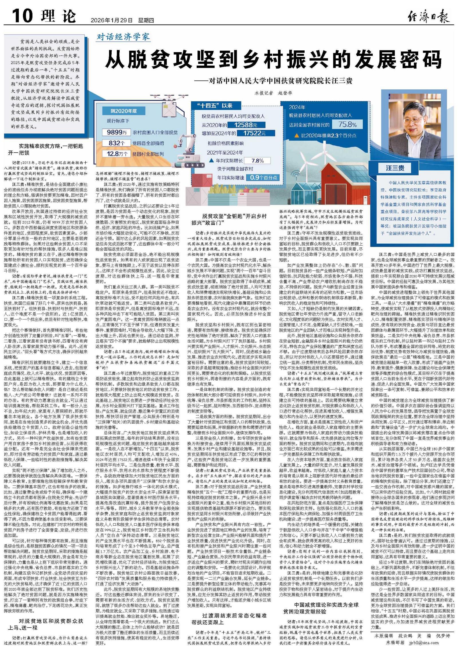 贫困是人类社会的顽疾,是全世界面临的共同挑战。反贫困始终是古今中外治国安邦的一件大事。2025年是脱贫攻坚任务完成后5年过渡期的最后一年,“十五五”时期是转向常态化帮扶的新阶段。本期“对话经济学家”邀请中国人民大学中国扶贫研究院院长汪三贵教授,从经济学视角解读中国减贫奇迹背后的逻辑,探讨巩固拓展脱贫攻坚成果同乡村振兴有效衔接的路径,以及中国减贫理论和实践的世界意义。