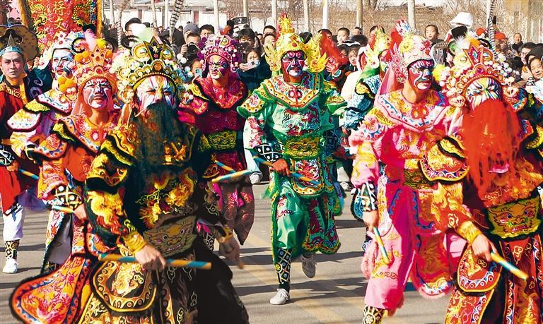 ◀2月17日,游客在山东省东营市东营区城南庙会观看国家级非遗潮汕英歌舞表演。