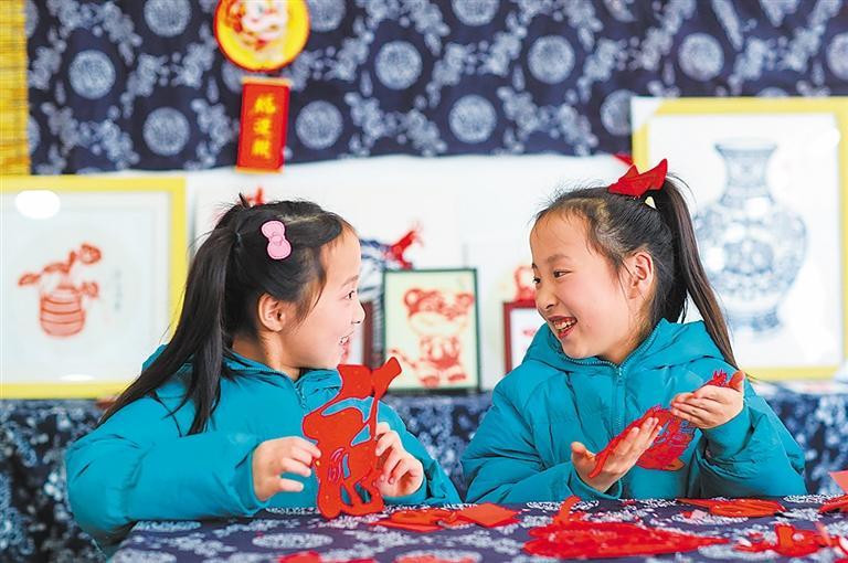 ◀2月14日,江苏省兴化市垛田街道乡村非遗艺术馆,孩子们在创作“马”主题的剪纸。