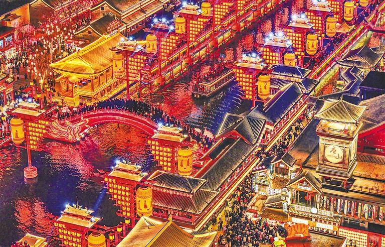 2月19日,河北省唐山市丰南区河头老街景区灯火璀璨,游客在此坐游船、看美景、品民俗,欣赏老街夜景,欢度新春佳节。