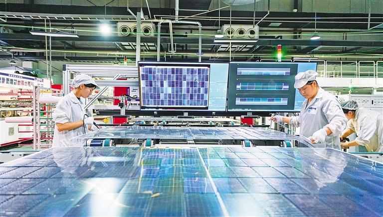 2月24日,江苏省宿迁市泗洪县经济开发区,江苏东磁新能源科技有限公司全线开工,员工正在生产线上赶制光伏设备出口订单。