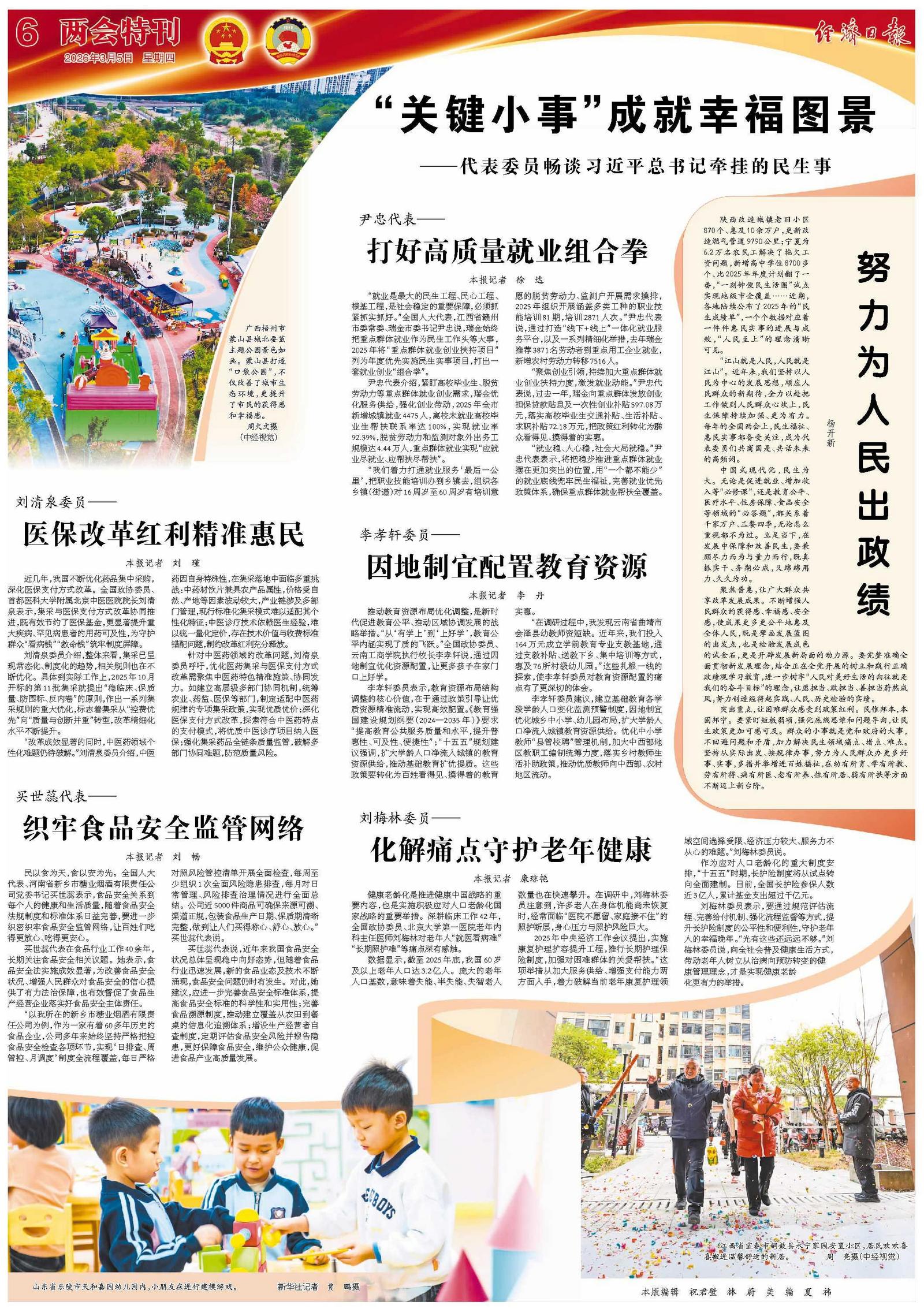 “江山就是人民,人民就是江山”。近年来,我们坚持以人民为中心的发展思想,顺应人民群众的新期待,全力以赴把工作做到人民群众心坎上,民生保障持续加强、更为有力。每年的全国两会上,民生福祉、惠民实事都备受关注,成为代表委员们共商国是、共话未来的高频词。