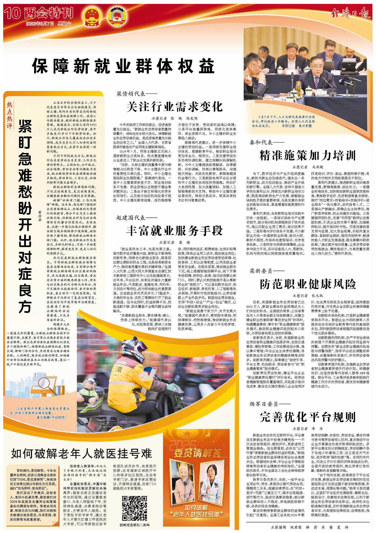 秦和代表建议,推进新职业培训高质量发展,要精准施策、综合发力。一是健全标准体系,加快制定新职业国家技能标准,聚焦数字经济、先进制造等重点领域,推行“岗位需求+技能培训+技能评价+就业服务”一体化模式,定向培育人才。二是强化产教融合,明确企业主体责任,推广新型学徒制、校企共建实训基地。三是建强师资队伍,完善“双师型”教师认定激励机制,引进企业技术骨干兼职,加强教师轮训,提升培训针对性。四是完善政策支持与监管,加大资金统筹,补贴向重点群体、紧缺职业倾斜,规范市场秩序,畅通技能人才职业发展通道,落实薪酬与职称政策。“通过提升培训质量,让更多劳动者凭技能就业、靠技能成才,为高质量发展注入持久动力。”秦和代表说。