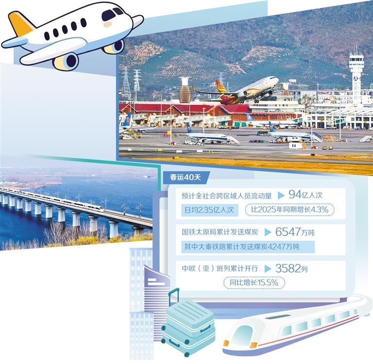 2026年春运近日落下帷幕。交通运输部统计数据显示,春运40天,预计全社会跨区域人员流动量94亿人次,日均2.35亿人次,比2025年同期增长4.3%,再创历史新高。