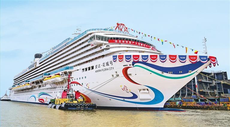 3月20日,第二艘国产大型邮轮“爱达·花城号”在上海出坞。这意味着该船的船体结构完整,已具备航行能力,全面转入码头调试阶段。“爱达·花城号”计划于今年底完成交付,将在广州南沙邮轮母港开启国际航线。新华社记者 丁 汀摄
