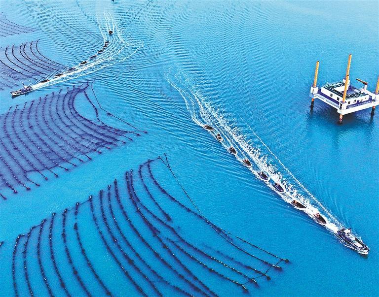 日前,山东省荣成市爱伦湾海洋牧场,渔民驾驶养殖船穿梭其中,开展海带养殖、筏架整理等养殖作业。近年来,当地坚持“科技兴海、以养兴渔”,推行浅海多营养层次养殖模式,海水养殖提质增效,“蓝色粮仓”更为充盈。王福东摄(中经视觉)
