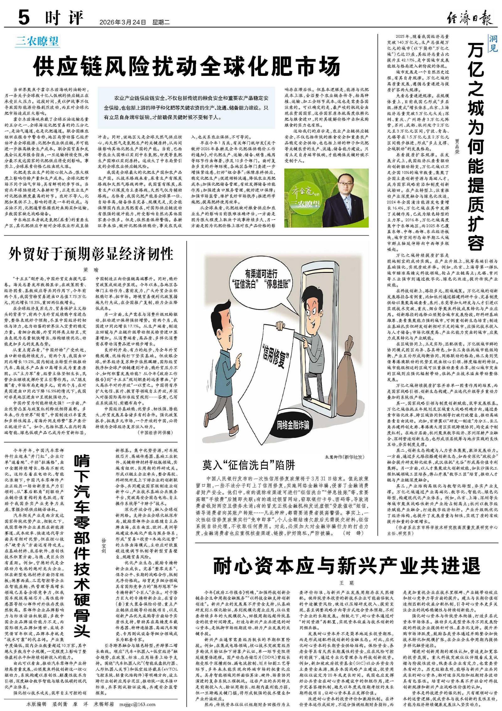 今年开年,中国汽车零部件行业迎来“开门红”,企业订单“追着跑”、干劲“拉满格”,出口金额持续增长、格局不断优化。这标志着在电动化、智能化浪潮下,中国汽车零部件产业正经历一场由新质生产力引领的、从“幕后配角”到驱动产业链价值重构的角色跃迁,有助于我国夯实产业竞争力底座、掌握全球供应链话语权。