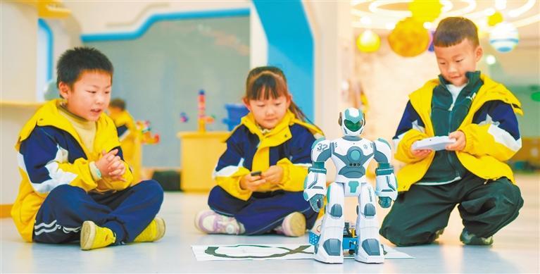 3月20日,四川省射洪市一幼儿园里,孩子们在课堂上学习操控机器人。