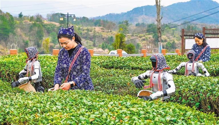 三月二十二日,湖北省黄冈市英山县乌云山村的茶园里,机器人与茶农一同采摘春茶。王 江摄(中经视觉)