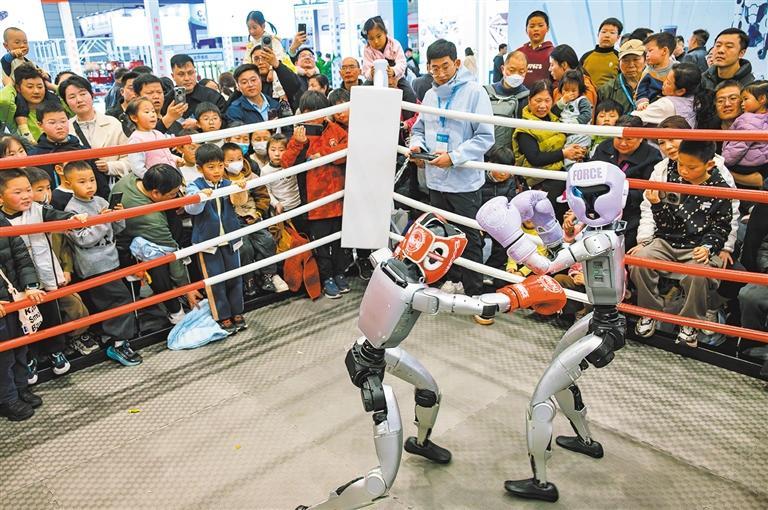 3月14日,安徽省2026合肥国际工业自动化暨机器人展览会现场,观众在观看人形机器人拳击比赛。何 玉摄(中经视觉)