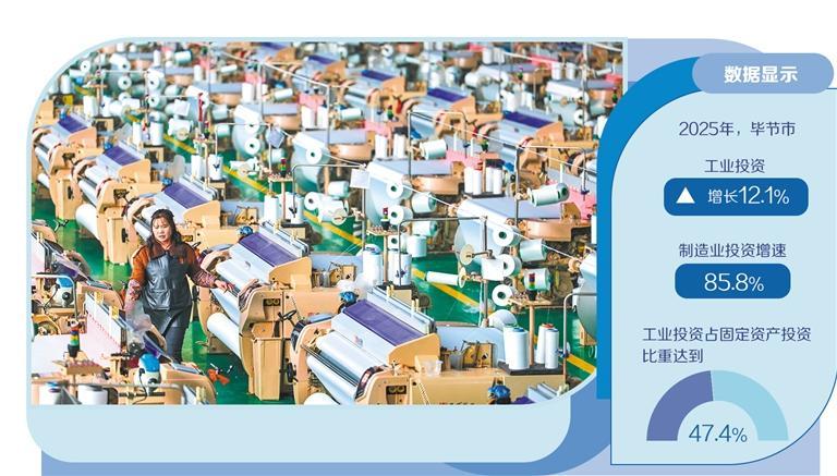这是毕节市发挥比较优势、深入推进新型工业化的一个生动缩影。近年来,毕节市科学谋划产业布局、狠抓项目落地,工业经济加速转型。数据显示,2025年,毕节市工业投资增长12.1%,制造业投资增速达85.8%,工业投资占固定资产投资比重达到47.4%。