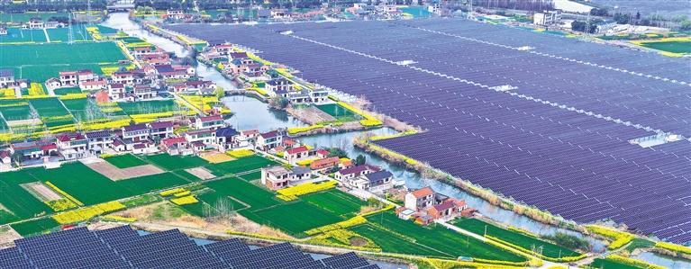 3月29日,江苏省海安市墩头镇双新村,光伏发电站与村庄、田园等相映成景。近年来,当地因地制宜发展“渔光互补”“农光互补”等模式的光伏发电项目,促进经济效益和生态效益双提升。 周 强摄 (中经视觉)