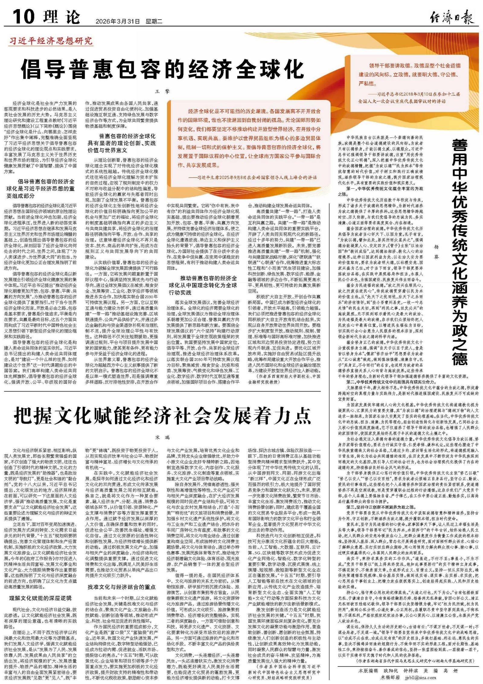 立足当下,面对百年变局加速演进、经济发展方式深刻转变、文化需求日益多元的时代背景,“十五五”规划纲要明确提出,完善文化管理体制和生产经营机制,实施积极的文化经济政策,大力发展文化旅游业,以文化赋能经济社会发展。今年的《政府工作报告》亦对促进人民精神生活共同富裕、发展文化事业和文化产业、大力提振消费等作出重要部署。这些既指明了文化与经济深度融合的前进方向,也明确了以文化为支点撬动高质量发展的路径。