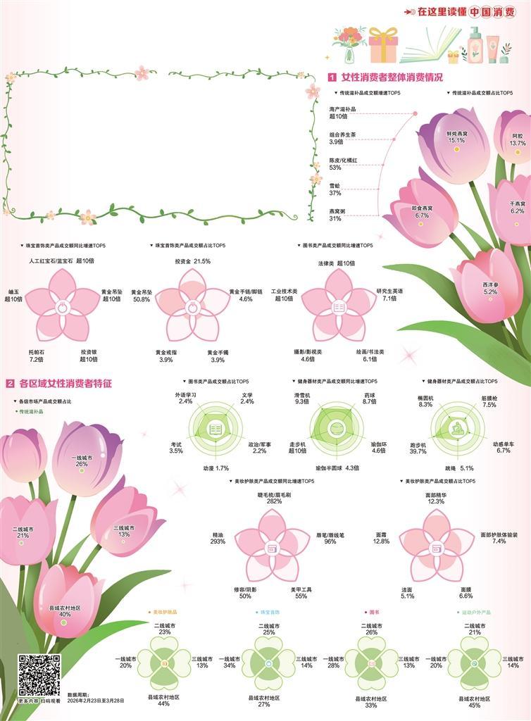 电商平台数据显示,女性的健身器材消费中,走步机成交额增速高居第一位,各种健身球、健身环等销量可观;女性的传统滋补品消费中,海产滋补品和鲜炖燕窝分别占据成交额增速和成交额占比的首位。在图书市场,女性消费者的工业技术类、法律类书籍成交额增长超10倍,考试类图书更是成为销冠。
