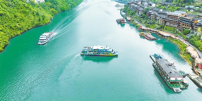 4月5日,游客乘船游览重庆市酉阳土家族苗族自治县乌江画廊。画廊两岸万木葱茏,春色宜人,吸引市民和游客前来游览观光。