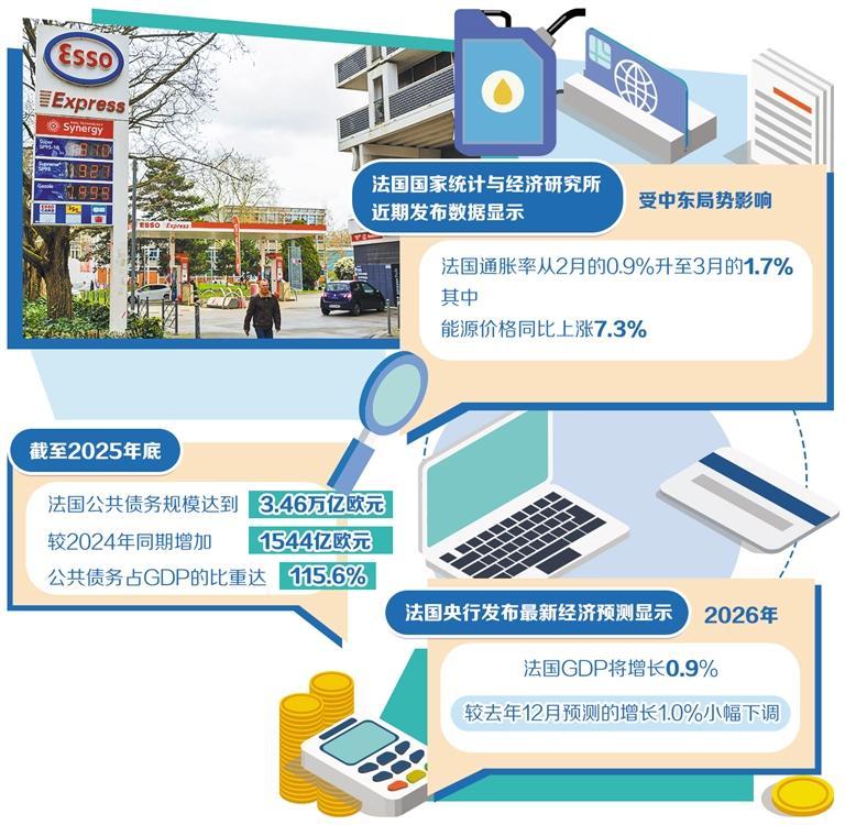 美以伊冲突引发的能源价格上涨对法国经济造成直接冲击。法国国家统计与经济研究所近期发布数据显示,受中东局势影响,法国通胀率从2月的0.9%升至3月的1.7%,其中,能源价格同比上涨7.3%,成为拉高通胀的核心推手。对此,法国国家统计与经济研究所经济预测部负责人多里安·鲁歇指出,国际环境已发生剧变,天然气和石油价格的持续飙升,将推升法国通胀率达2%左右,并通过物价波动直接冲击法国经济。同时,能源价格剧烈波动还对法国经济增长产生了“紧急制动”的负面效应。法国央行发布最新经济预测显示,2026年法国国内生产总值(GDP)将增长0.9%,较去年12月预测的增长1%小幅下调。对此,荷兰国际集团等经济机构经济学家评估认为,相关数据已反映出第一轮通胀冲击已经开始显现,法国经济本就脆弱的复苏动能正被迅速消耗。