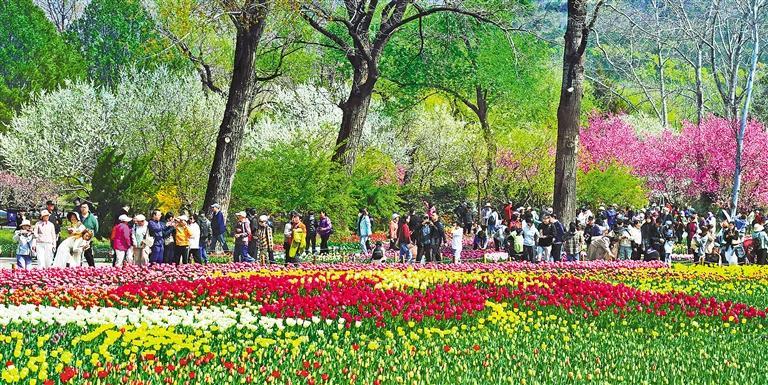 4月8日,北京市海淀区的国家植物园北园内,郁金香进入最佳观赏期。红、黄、粉、紫等各色郁金香竞相绽放,与周边桃花、樱花相映成趣,引来众多市民、游客前来观赏打卡。