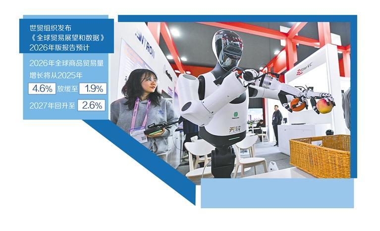 世贸组织日前发布《全球贸易展望和数据》2026年版报告指出,受地缘政治紧张等因素影响,2026年全球商品贸易量和服务贸易量增长均将明显低于2025年水平。积极因素是,人工智能(AI)相关产品的贸易预计仍将高度活跃,在支撑贸易增长中发挥关键作用。