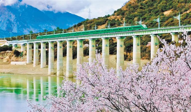 2025年3月25日,拉林铁路林芝市境内沿线,桃花盛放,一列复兴号列车飞驰而过。