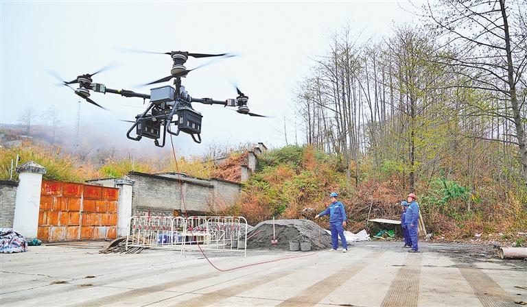 近日,藏东南至粤港澳大湾区±800千伏特高压直流输电工程云南段线路首基铁塔基础,在云南省怒江州贡山县开始浇筑,标志着该工程云南段线路进入施工阶段。图为南网超高压公司大理局建设者用重载无人机运输物料。吴志龙摄(中经视觉)