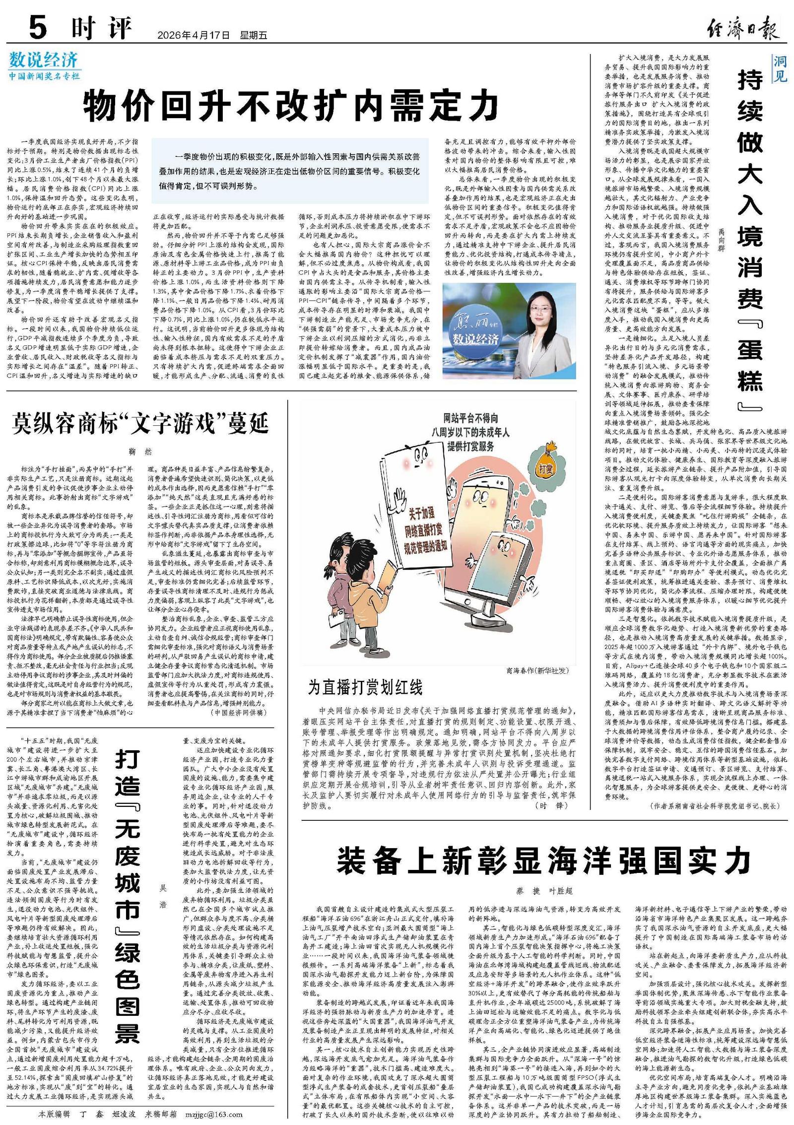 总体来看,一季度物价出现的积极变化,既是外部输入性因素与国内供需关系改善叠加作用的结果,也是宏观经济正在走出低物价区间的重要信号。积极变化值得肯定,但不可误判形势。面对依然存在的有效需求不足矛盾,宏观政策不会也不应因物价回升而转向,而是要在扩大内需上持续发力,通过精准支持中下游企业、提升居民消费能力、优化投资结构,打通成本传导堵点,让物价的积极变化从结构性回升走向全面性改善,增强经济内生增长动力。