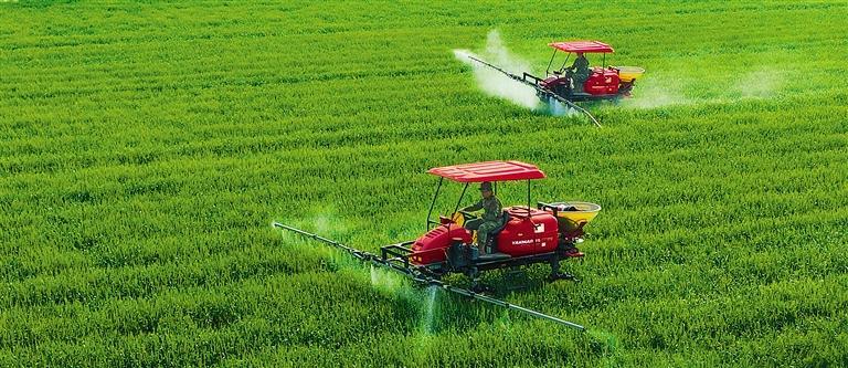 4月20日,江苏省太仓市双凤镇庆丰村富华农场专业合作社,植保机械穿梭在田间为小麦喷洒药物。眼下,小麦进入抽穗扬花期,当地组织开展小麦田间管理,确保夏粮增产增收。计海新摄(中经视觉)