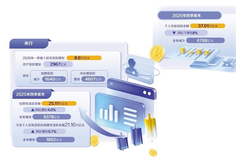 2025年全年,结构性分化趋势更为明显。在房地产市场深度调整和扩大内需、提振消费的政策背景下,各板块运行格局正发生变化。中国人民银行发布的2025年四季度金融机构贷款投向统计报告显示,2025年四季度末,个人住房贷款余额37.01万亿元,同比下降1.8%,全年减少6768亿元。与此同时,住户消费贷款及经营贷款保持增长,2025年四季度末,经营性贷款余额25.11万亿元,同比增长4.0%,全年增加9378亿元;不含个人住房贷款的消费性贷款余额21.16万亿元,同比增长0.7%,全年增加1802亿元。