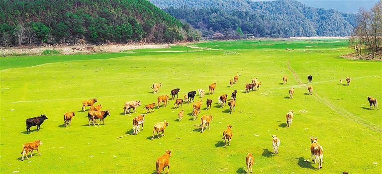 3月10日,江西省泰和县桥头镇南车水库,成群的黄牛在草地上悠闲觅食。