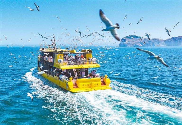 2025年6月23日,山东省荣成市成山镇北部海域海驴岛,游客乘船体验海上游,与黑尾鸥互动。 李信君摄(中经视觉)