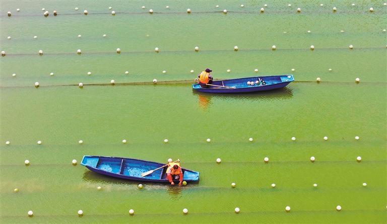 4月23日,江苏省扬州市宝应县广洋湖镇严桥村,珍珠蚌养殖户在水上管护珍珠蚌幼苗。该镇大力发展“鱼+珍珠”立体混养模式。沈冬兵摄(中经视觉)