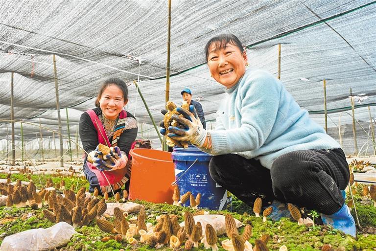 3月9日,湖北省黄冈市浠水县戴家洲,农户在大棚内收获羊肚菌。王 江摄(中经视觉)