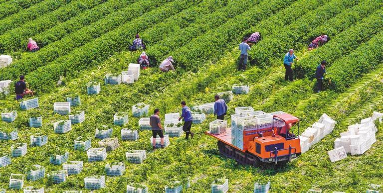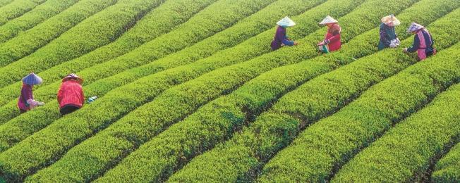 4月1日,浙江省嵊州市崇仁镇东风茶场,茶农在采摘春茶。潘伟峰摄(中经视觉)