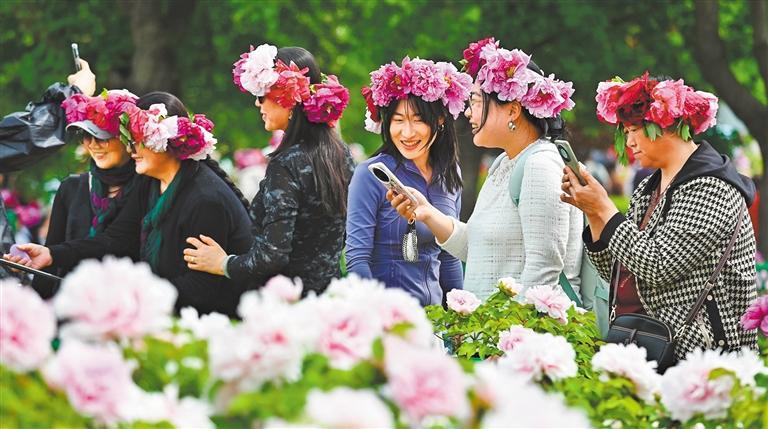 4月11日,游人在山东省菏泽市曹州牡丹园里赏花游玩。2025年菏泽牡丹产业总产值突破130亿元。