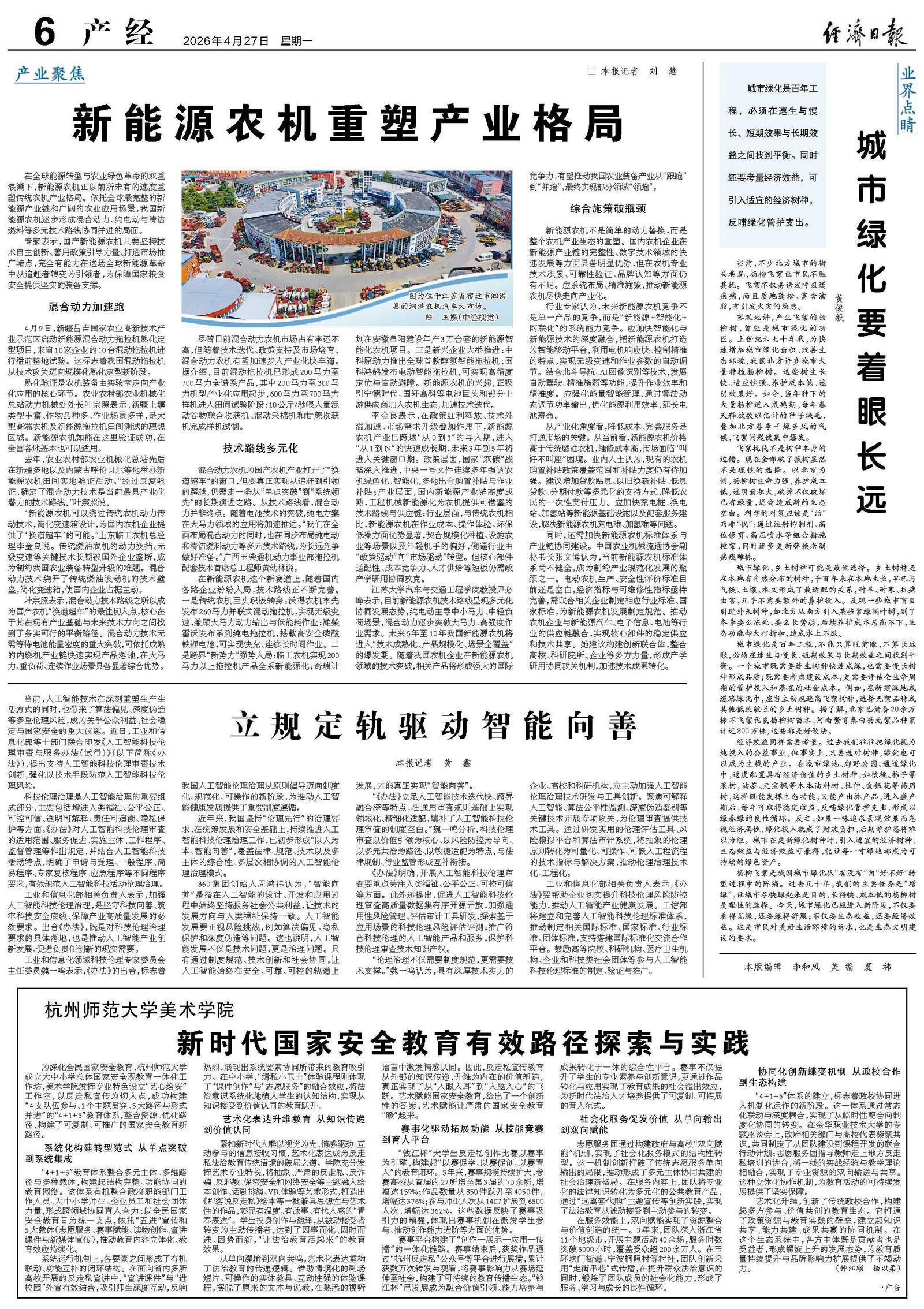 江苏大学汽车与交通工程学院教授尹必峰表示,目前新能源农机技术路线呈现多元化协同发展态势,纯电动主导中小马力、中轻负荷场景,混合动力逐步突破大马力、高强度作业需求。未来5年至10年我国新能源农机将进入“技术成熟化、产品规模化、场景全覆盖”的爆发期。随着我国农机企业在新能源农机领域的技术突破,相关产品将形成强大的国际竞争力,有望推动我国农业装备产业从“跟跑”到“并跑”,最终实现部分领域“领跑”。